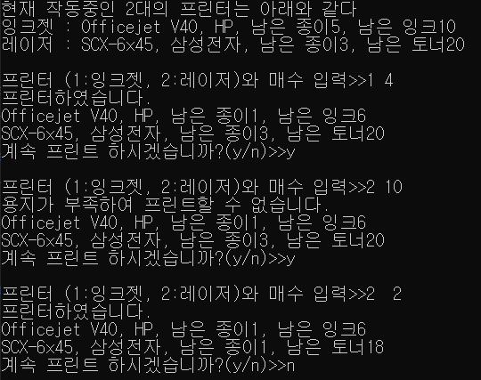 모든 프린터는 모델명(model), 제조사(manufacturer), 인쇄 매수(printedCount), 인쇄 종이 잔량(availableCount)을 나타내는 정보와 print(int pages) 멤버 함수를 가지며, print()가 호출할 때마다 pages 매의 용지를 사용한다. 잉크젯 프린터는 잉크 잔량(availableInk) 정보와 printInkJet(int pages) 멤버 함수를 추가적으로 가지며, 레이저 프린터는 토너 잔량(availableToner) 정보와 역시 printLaser(int pages) 멤버 함수를 추가적으로 가진다. 각 클래스에 적절한 접근 지정으로 멤버 변수와 함수, 생성자, 소멸자를 작성하고, 다음과 같이 실행되도록 전체 프로그램을 완성하라. 잉크젯 프린터 객체와 레이저 프린터 객체를 각각 하나만 동적 생성하여 시작한다.